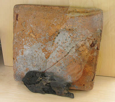 Hypokaustziegel mit Abdruck eines genagelten Schuhs, davor ein solches Exemplar