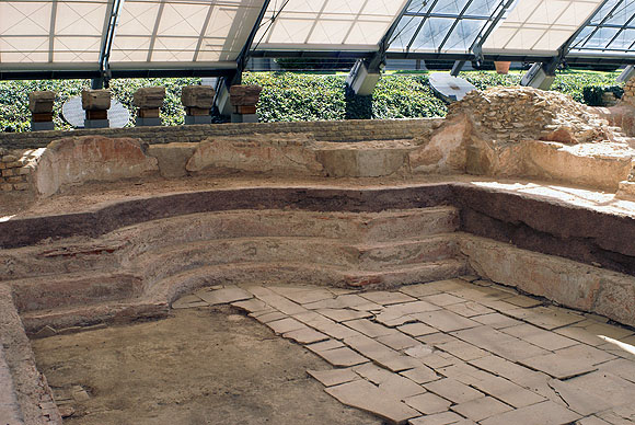 Mitte: Kreisrundes Kaltbade-Becken auf der Nordseite der Anlage