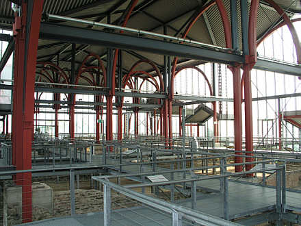 in seiner Stahlkonstruktion nach. Rot sind die Elemente des antiken