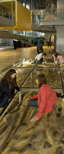 Eine begehbare Glasplatte deckt Wagenspuren und andere archäologische