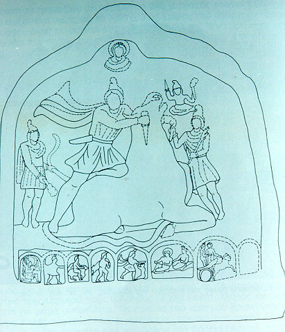 dargestellt, wie er den Stier tötet. Links und rechts stehen die Begleiter
