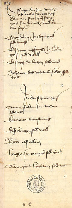 Caspar der Huren wirt ... Das Verzeichnis beginnt mit den 8 Bewohnerinnen des "rechten Frauenhauses" und nennt dann die übrigen Prostituierten der stadt namentlich auf. Das Straßburger Verzeichnis bildet den Auftakt zu einer Beschränkung der Dirnen auf bestimmte Häuser und Straßen in der Stadt. |