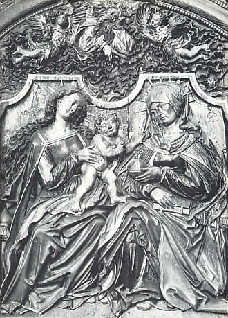 Heilige Anna Selbdritt Holzrelief, Hans Wydyz, Straßburg, um 1520 In der formalen Komposition werden Maria mit ihrer Mutter Anna und dem Jesuskind auf einer Bank sitzend dargestellt. Die mädchenhafte Erscheinung Marias kontrastiert mit der Darstellung ihrer Mutter als ältere, verheiratete Frau. Entsprechend unterschiedlich ist die Kleidung: Maria trägt das Haar offen, das Kleid hat einen weiten Ausschnitt, Anna trägt einen voluminösen Mantel, das Schultertuch der Haube bedeckt Schultern und Brust. |
