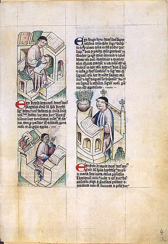 Schreiber bei der ArbeitGelehrtenporträts in einem Rechtsgutachten Die Porträts zeigen die typische Möblierung einer spätmittelalterlichen Schreibstube, die aus einer mit einem Tich fest verbundenen Bank besteht. Bücher liegen neben oder hinter dem Schreiber aufgetürmt und griffbereit. |