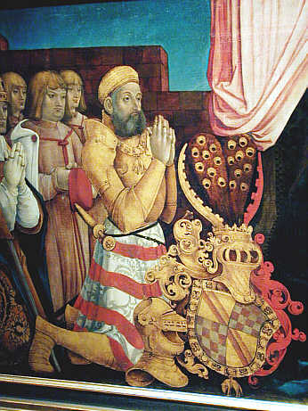 Detail: Markgraf Christoph von Baden, in goldener Rüstung, mit rot-weiß gestreiftem Waffenrock. Vor ihm das Baden-Sponheimische Wappen.