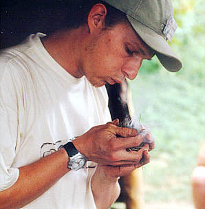 Der Gluthaufen wird dann durch sorgfältiges Blasen soweit erhitzt, dass das Material Feuer fängt.