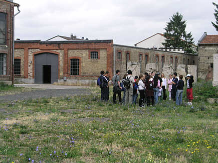 Blick über die beiden Appellplätze zur Fabrikhalle mit dem Schlaf- und Aufenthaltsraum für die Häftlinge
