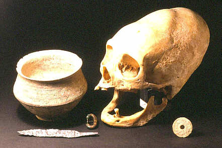 Schädel einer nur 1,55 m großen grazilen Frau von etwa 70 Jahren, wohl nach hunnischer Sitte künstlich zu einer extremen Länge von mehr als 18 cm deformiert.