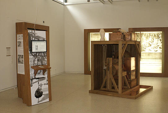 Blick in den Ausstellungsraum mit Transparent-Grafiken, Multimedia-Säule und der Neuerfindung der Wasserorgel