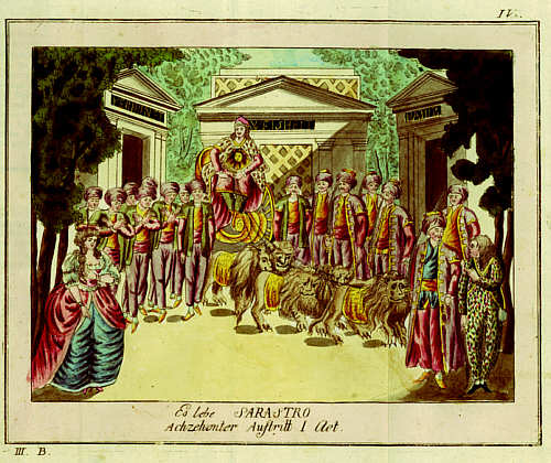 Unbekannt nach Joseph Schaffer, Szenenbilder zur Zauberflöte, in: Allgemeines europäisches Journal, Brunn 1795,1..4., 6-1. Band, kolorierte Radierungen (Olmütz, Wissenschaftliche Bibliothek), Einzug Sarastros auf dem Löwenwagen (I, 18)