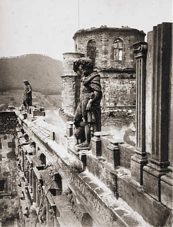 Für dieses Bild legte Richard wohl ein Brett von seinem Gerüst zum obersten Sims des Ottheinrichsbaus; er erhielt so eine der gewagtesten Aufnahmen aus dieser Frühzeit der Fotografie.