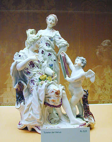 Venus, ganz im til der höfischen Welt gekleidet, sitzt auf einem Stuhl, ihr zur Seite eine Zofe, während ein Eros ihr den Spiegel ihrer Schönheit hält.