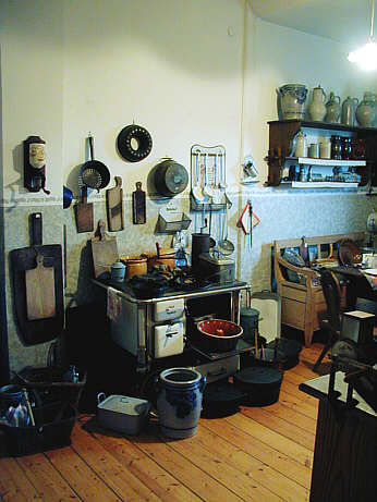 Die Küche Kohleherd mit Backofen, dazu allerhand Küchengeschirr und -geräte. |
