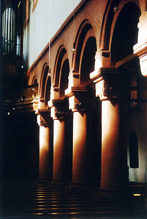 gleichmäßige Arkaden auf Säulen mit skulptierten Würfelkapitellen ruhend, 1963/64 farblich gefasst