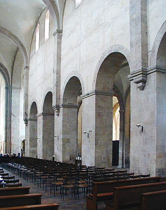 Romanische Pfeilerbasilika mit Kreuzgratgewölbe im gebundenen System. Rechteckvorlagen, die in Höhe der Arkadenzone beginnen, tragen breite Gurtbögen. Flach geschlossene Chorwand mit 5 rundbogigen Fenstern.