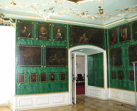 Arbeitszimmer des Abtes Benedikt Knittel, grüne Wandbespannung mit aufgemalter Bildergalerie.