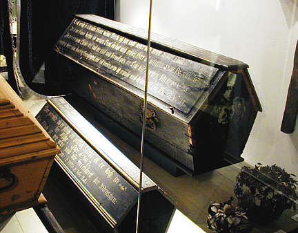 Protestantische Prunksärge Mit Bibelversen beschriftete Übersärge, in die die eigentlichen Zinksärge eingebettet waren. |