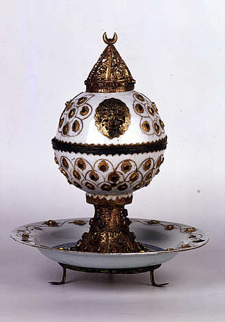 1550-1600, Ming Dynastie, China, mit osmanischen Zusätzen, ca. 1600 Porzellan, Gold, Rubine, Smaragde, Silber, Metall und Perlen Höhe 25 cm Topkapi Saray Museum, Istanbul Foto Hadiye Cangokce
