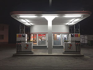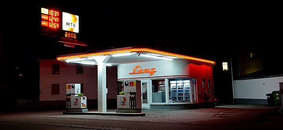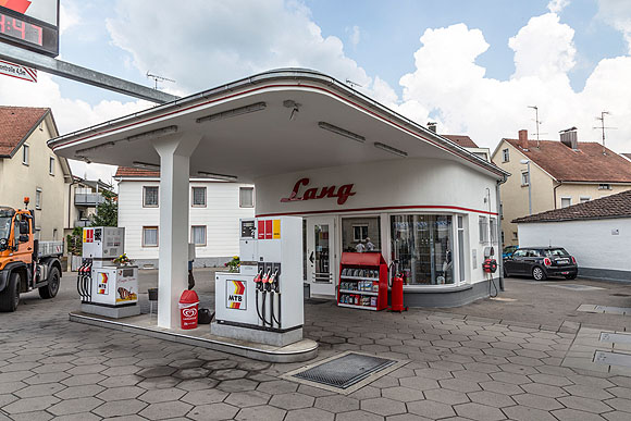 So traut man fast seinen Augen nicht, wenn man an der Ravensburger Straße im oberschwäbischen Tettnang tatsächlich noch eine alte Tankstelle in Betrieb entdeckt. Und dass sie alt ist, macht ein Vergleich mit einer heute üblichen Tankstation in der unmittelbaren Nachbarschaft deutlich. Die Dimensionen wirken dagegen fast puppenhaft. Gerade einmal zwei Zapfsäulen stehen rechts und links einer Stütze, die sich nach oben erweitert und mittig eine profilierte, nach vorne abgerundete Kragplatte trägt. Sie überdacht nur eine einzige Autovorfahrt, deren geringe Durchfahrtshöhe hohe Lastwagen kaum zulässt. Wie das Dach so ist auch der darunter geschobene Kassenraum mit seinem abgerundeten Grundriss und dem charakteristischen, ebenso gerundeten Fensterband, dem weißen Anstrich über grauem Sockel und einem schmalen, über den Fenstern umlaufenden roten Streifen der Ästhetik des Neuen Bauens der späten Zwanziger Jahre verpflichtet.
