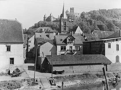 Blick vom gegenüberliegenden Tauberufer auf Stadt und Schloss Badische Bahnlinie Heidelberg - Würzburg |