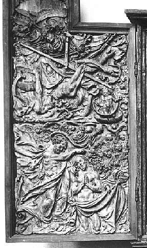 Der linke Flügel zeigt als Holzschnitz-Relief die Seelenwägung am Tag des Jüngsten Gerichts  (oben) und die Taufe Christi (unten)