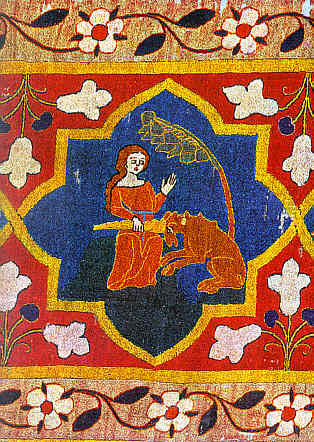 Der Teppich war wahrscheinlich ein "Rücklaken", ein über einer Bank angebrachter Teppichstreifen. Die Medaillons tragen Darstellungen mit den so genannten "Weiberlisten" oder "Minnesklaven", die das Unheil der weltlichen und sinnlichen Liebe der Macht der geistigen Minne gegenüberstellen. Samson, der Held es Alten Testaments, bezwingt zwar den Löwen (unten links), erliegt aber der Macht einer Frau, der griechische Philosoph Aristoteles erliegt schließlich den Listen der Hofdame Phyllis (unten rechts), und auch Virgil und Iwein verlieren ihre Kraft gegenüber einer Frau. Allein die keusche Jungfrau hat die Macht, das verfolgte Einhorn in ihrem Schoß zu bergen (ganz unten).