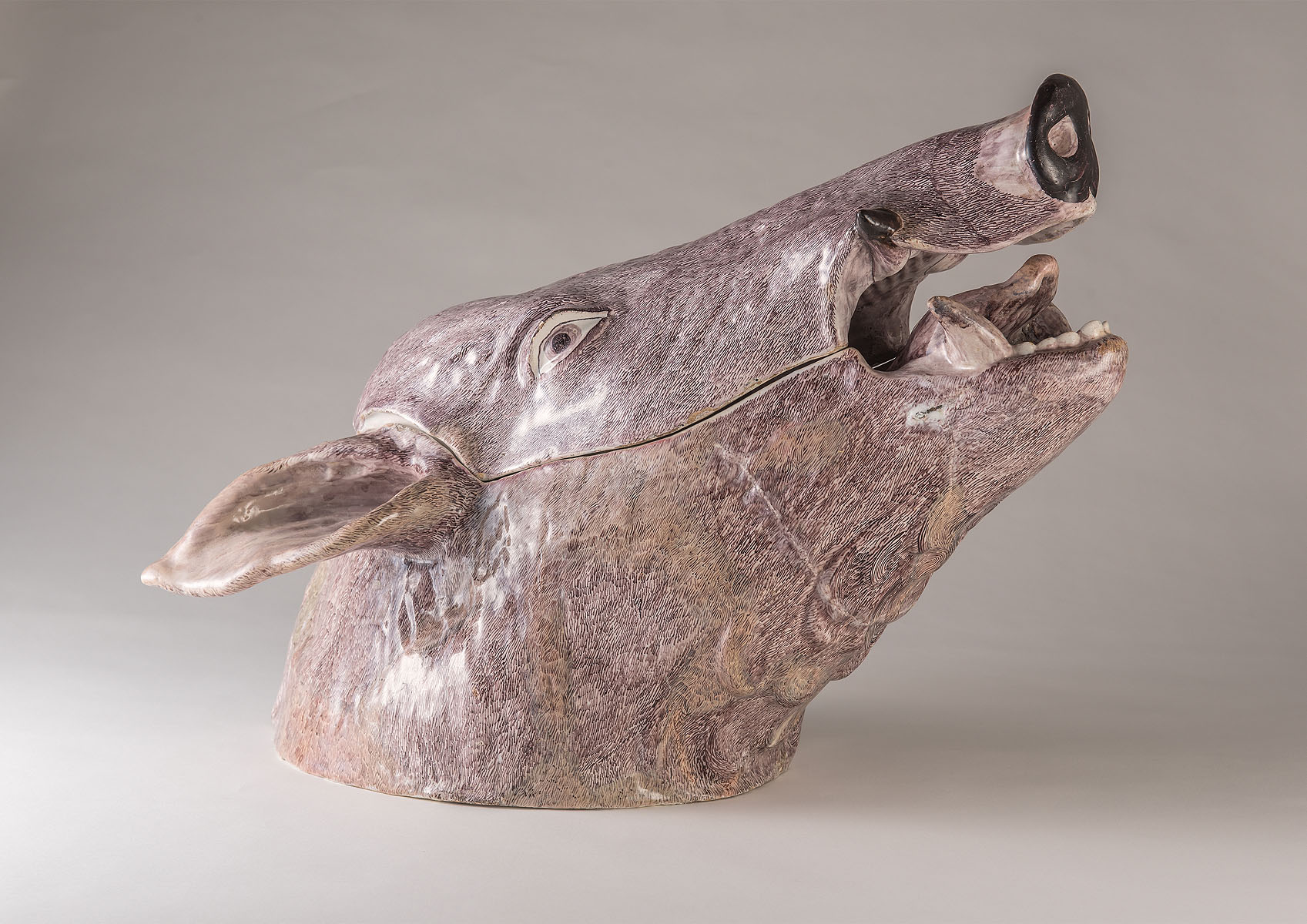 Das Verhältnis von Mensch-Tier hat sich in der Kulturgeschichte immer wieder stark verändert: War ein Affenfellmuff um 1900 todschick und kennzeichnete seinen Besitzer oder seine Besitzerin als Person mit exklusivem Geschmack, so würde solch ein Muff mit 21 cm langem schwarzen Affenhaar (Bild links) heute große Empörung hervorrufen. Die jungen Nachwuchswissenschaftlerinnen und -wissenschaftler berichten über den Sinn von antiken Spitzmaussärgen oder barocken Eberkopfterrinen (Bild unten) und fragen, inwiefern Tamagotchis im Plastikei als technische Haustiere den Umgang mit echten Lebewesen verändern.