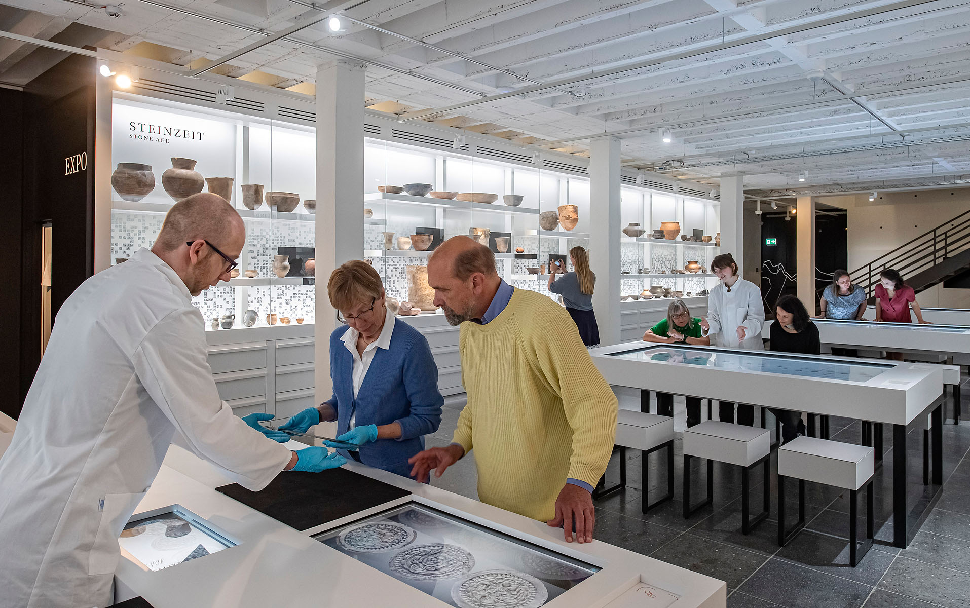 Die neue Abteilung „Archäologie in Baden – Expothek¹“ führt die Besucherinnen und Besucher zu den Anfängen der menschlichen Kulturgeschichte im badischen Raum. Sie verschmilzt analogen Museumsbesuch mit neuesten digitalen Anwendungen. Geschulte Museumsmitarbeiter-innen und -mitarbeiter legen nach Bestellung Originale aus den Vitrinen vor und geben persönlich Auskunft. Diese Explainerinnen und Explainer sind darüber hinaus Ansprechpartnerinnen und Ansprechpartner für die digitalen Tools der Ausstellung. In dem neuen, 30-minütigen Format „Tipps für Nutzerinnen und Nutzer“ erklären sie mittwochs und sonn