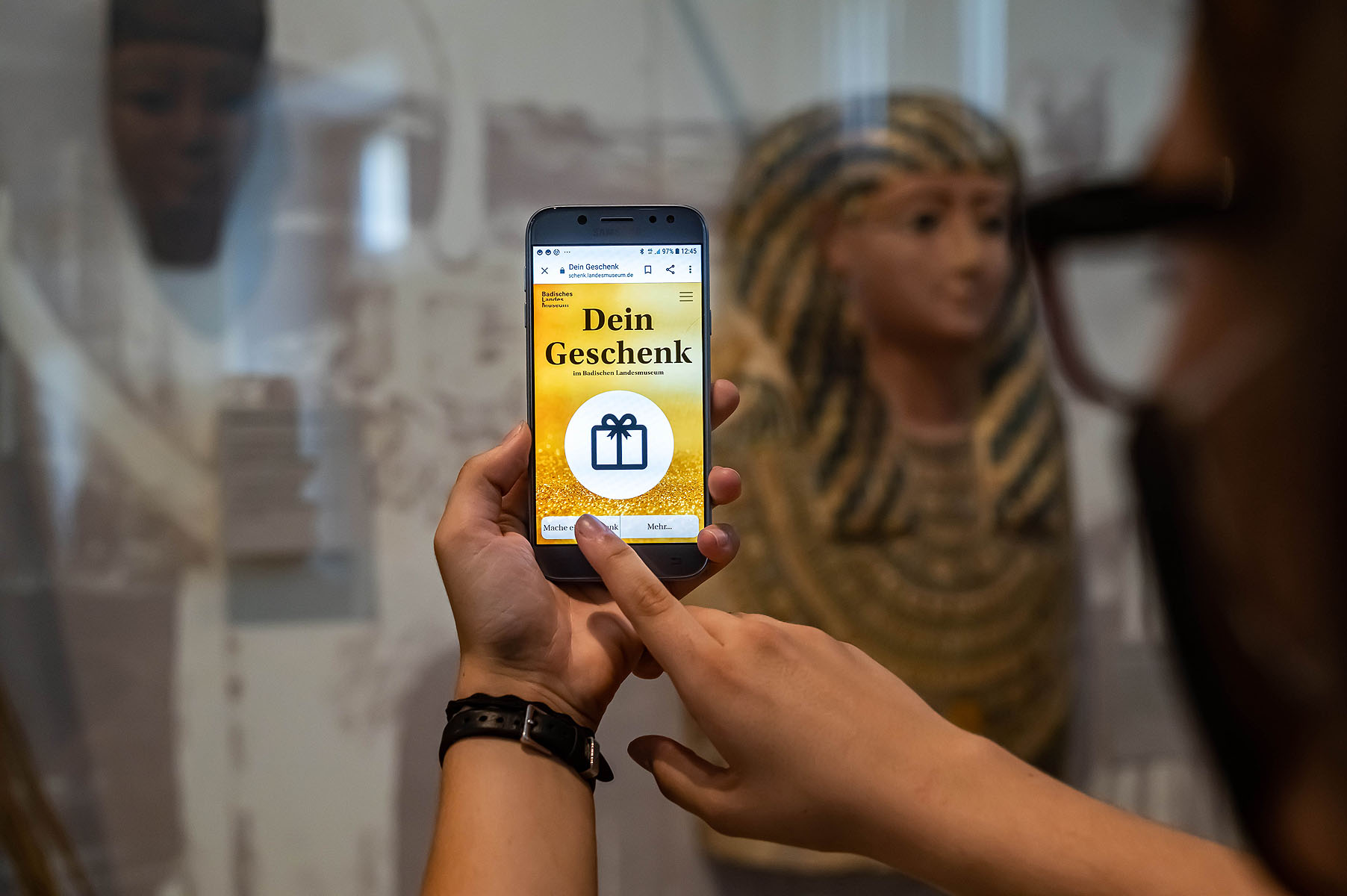 Alleine im Museum – und dennoch Eindrücke mit anderen teilen? Mit der Museums-App „Dein Geschenk“ kreieren die Besucherinnen und Besucher ihren individuellen Content. Dafür wählen sie vor Ort Objekte aus, fotografieren sie und erstellen Sprachnachrichten. Die App fasst diese Museumserfahrung zu einem digitalen Paket zusammen und verschickt es als persönliches Geschenk an Freunde und Bekannte. 2021 veröffentlicht das Badische Landesmuseum nun die zweite Ausbaustufe von „Dein Geschenk“: In Zukunft können die Besucherinnen und Besucher auch öffentliche Geschenke erstellen.