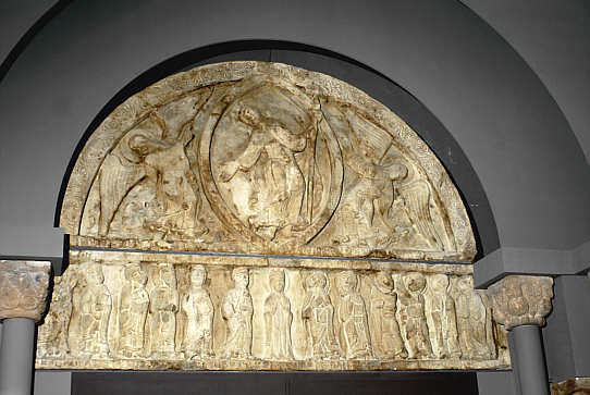 Im Bogenfeld die Himmelfahrt Christi, der sich den Zurückbleibenden