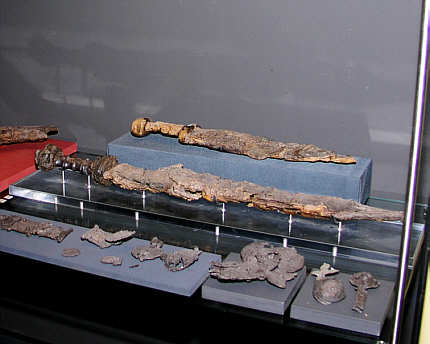 Römisches Kurzschwert (Mitte) und Eisendolch mit Knochengriff (oben)
