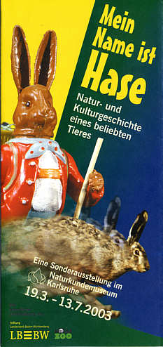 Einem unserer beliebtesten Wildtiere widmet das Naturkundemuseum Karlsruhe die große Sonderschau "Mein Name ist Hase - Natur- und Kulturgeschichte eines beliebten Tieres". Auf über 700 m2 in 3 Sälen vermittelt die vom 19. März bis 13. Juli 2003 laufende Ausstellung nicht nur alles Wissenswerte aus naturkundlicher Sicht, sondern bietet auch eine Rundumschau über die vielfältigen Aspekte seiner Kulturgeschichte, in Mythologie, Religion, Volksglaube und Brauchtum. Im naturkundlichen Teil vermitteln Exponate, ein naturgetreu gestaltetes Diorama, ein Kaninchenbau und anschauliche Illustrationen ein umfassendes Bild von Lebensraum, Lebensweise und biologischen Besonderheiten von Hase, Kaninchen und Anverwandten. Auch der starke Rückgang des Hasen und seine Ursachen werden angesprochen. Die Themenbereiche Zucht und Jagd gehen auf die Bedeutung der Tiere für den Menschen ein und leiten über zum kulturhistorischen Bereich. Der zweite Teil der Ausstellung widmet sich der kulturgeschichtlichen Bedeutung dieses beliebten Tieres: Der Hase hat in den verschiedenen Kulturen eine recht unterschiedliche Bedeutung gehabt. Als Osterhase oder asiatischer Glücksbringer, als Symbol für Fruchtbarkeit, Erotik, als Sinnbild des Mondes, oder auch Hexentier und Dämon schlüpfte er in die unterschiedlichsten Rollen. |