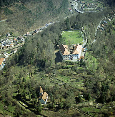 Neues Schloss (16./17.Jh.) und Burgruine (dahinter, Mitte 12.Jh.) auf dem Schlossberg, von Westen vorn die ehem. Schlosskirche, jetzt Friedhofskirche St. Georg