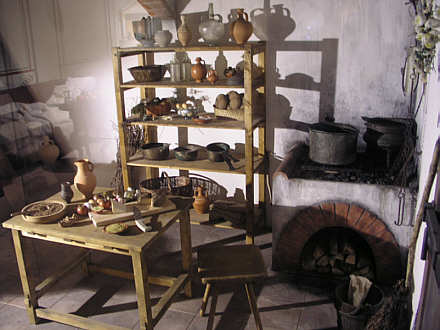 Rechts in der Ecke der offene Herd, daneben Stellagen zur Aufbewahrung von Geschirr, in der Mitte ein kleiner Tisch mit typischem Gerät.