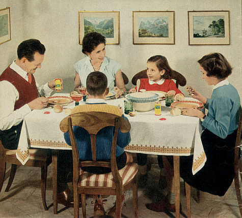 Bürgerliche Kleinfamilie bei Tisch. Anonym. Um 1960.