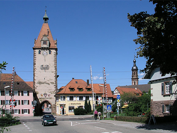 ![]() Der Niklasturm ist der westliche Turm der Stadtbefestigung in Richtung Offenburg. Sein Untergeschoss stammt aus dem 14. Jahrhundert, die achteckigen Obergeschosse sind von 1582. Das Kinzigtor (Bild unten) ist der südliche Turm der Stadtbefestigung. Sein Untergeschoss stammt aus dem 14. Jahrhundert, das Dach vom Ende des 17. Jahrhunderts. Hier von der Feldseite aus gesehen, im Hintergrund rechts der Turm der Klosterkirche. |