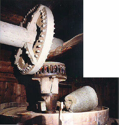 Die Transmission im Hintergrund überträgt die Kraft des Mühlrads