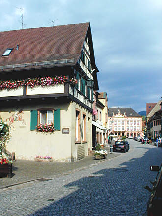 von Offenburg her, Fachwerkbau des 18. Jahrhunderts, im Hintergrund