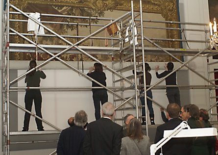 Ein spannender Moment: Vom Gerüst herab werden die Teppiche entrollt und entfalten ihren Glanz erstmals in der "richtigen" Position.