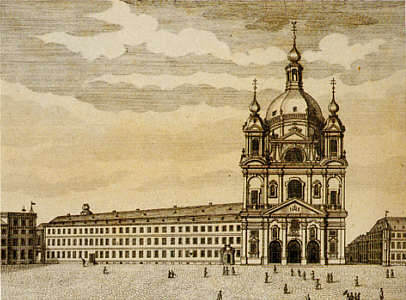 Als "Große Hofkirche" bezeichnete Ansicht von Jesuitenkirche und Jesuitenkolleg. Links das Schloss mit dem Durchgang zum Schlossgarten.