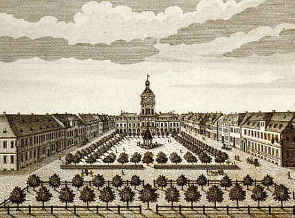 Unbebautes Quadrat O 1, 1734 als Platz gestaltet. In der Mitte die 1742 aufgestellte Grupellopyramide, an den Seiten eine doppelte Baumreihe und eine niedere Abgrenzungsmauer. Im Hintergrund das Kaufhaus.
