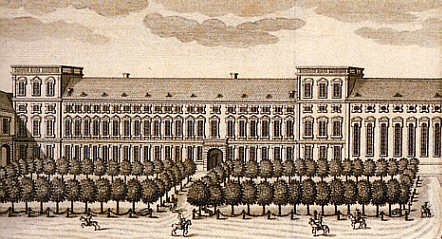 Das Schloss Perspektivisch nicht ganz korrekte Ansicht des kurfürstlichen Residenzschlosses. Im Vordergrund links der Ostflügel mit der Schlossbibliothek, rechts der Westflügel (Gerichtsflügel) mit der Schlosskirche. Den Ehrenhof schließt eine geschwungene Balsutrade mit zwei Wachhäuschen zur Stadt hin ab. |