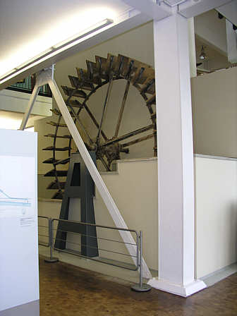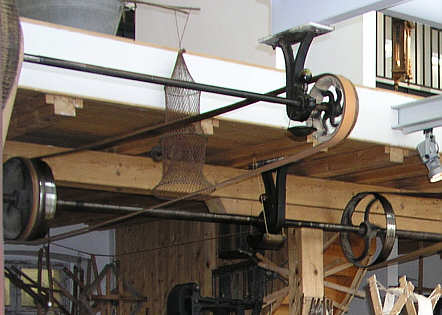 Das Wasserrad erzeugte eine Drehenergie, die auf eine Welle übertragen wurde. Diese Bewegung wurde durch Übersetzungen (im Bild unten an der Wand) auf feststehende Wellen und Scheiben und von da mit Lederriemen auf andere Wellen umgeleitet.
