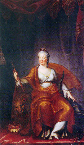| Heinrich Carl Brandt: Kurfürstin Elisabeth Auguste mit Füllhorn, 1767/70 Die Kurfürstin sitzt als Herrscherin auf einem Löwen, auf dessen Kopf sie sich mit einem Szepter stützt. Zu Füßen des Löwen liegt der Kurhut. Das Füllhorn, aus dem sie Goldmünzen schüttet, weist sie gleichzeitig als freigebige Fürstin aus. Das repräsentative und anspruchsvolle Porträt geht auf einen Entwurf Peter Anton von Verschaffelts zurück und entstand sehr wahrscheinlich anlässlich der offiziellen Eröffnung der Mannheimer Zeichnungsakademie 1769, an der sowohl Brandt als auch Verschaffelt entscheidend mitwirkten. |