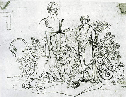 Die Zeichnung zeigt Justitia vor einer Säule mit der Büste des Kurfürsten Carl Theodor. |