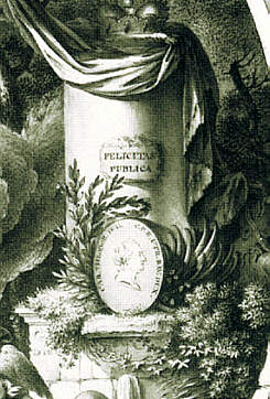 | Ignaz Verhelst: Allegorie auf Carl Theodor als weisen Herrscher und Kunstmäzen (Detail), um 1779 Der Säulenstumpf trägt die Inschrift "Felicitas publica" ("öffentliches Glück"), an ihm steht, geschmückt mit Lorbeer- und Palmzweig, das Medaillon mit dem Bild des Kurfürsten und der Inschrift "CAR[OLUS] THEODOR[US] D[EI] G[RATIA] P[ALATINUS] R[HENI] UTR[IUSQUE] BAV[ARIAE] DUX" |