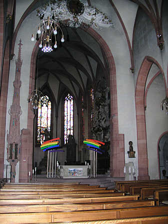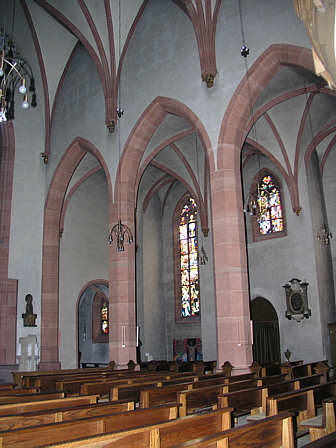 Innenaufnahmen: Langhaus mit Chor und Langhausaufriss.