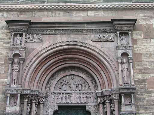 Die obere Zone der Galluspforte nimmt eine Darstelung des Jüngsten Gerichts ein: Links undrechts zwei posauneblasende Engel, daneben jeweils aus ihren Gräbern auferstehende Tote