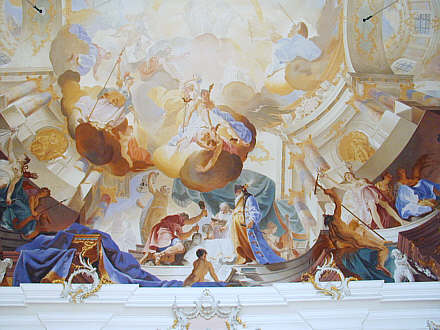 Das Deckenfresko stellt "Gestalten der antiken Mythologie und christliche Tugenden als Schützer der fürstbischöflichen Länder" dar. Das Original von Johannes Zick, 1751, wurde im 2. Weltkrieg zerstört und 1964 - 66 von Wolfram Köberl neu gemalt.