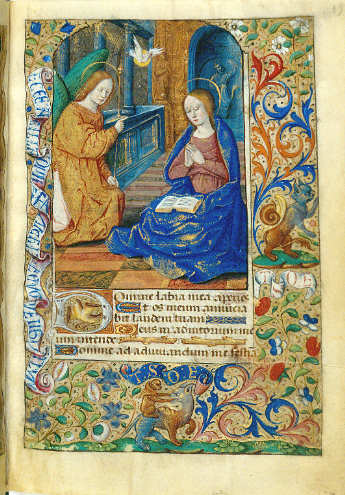 Verkündigung Mariens auf einem Rankengrund mit Fabeltieren